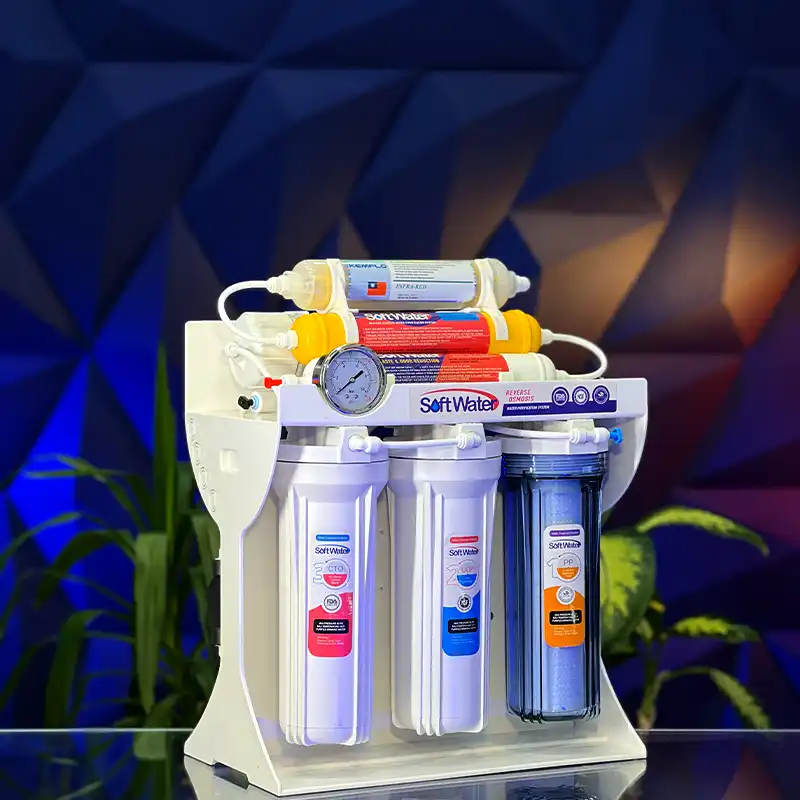 دستگاه تصفیه آب خانگی سافت واتر 7 مرحله ای، یک آب شیرین کن خانگی با فیلترهای شش مرحله ای تایوانی است. در این دستگاه، اسمز معکوس میزان PH آب را تنظیم می‌کند.